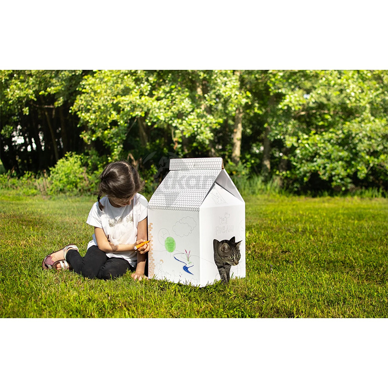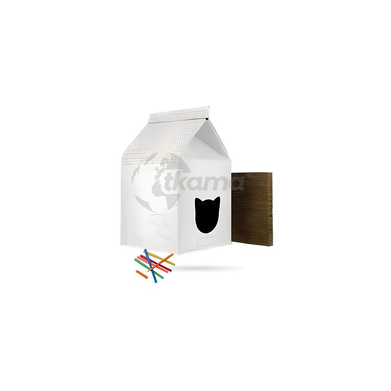 Kit creativo en forma de caseta para gato diseñado para montar y personalizar mediante coloreado. Fabricada en cartón resistente y seguro para mascotas. Ideal como actividad manual infantil y espacio de descanso temporal para gatos pequeños y medianos.