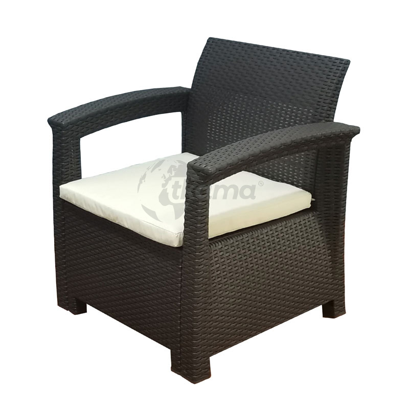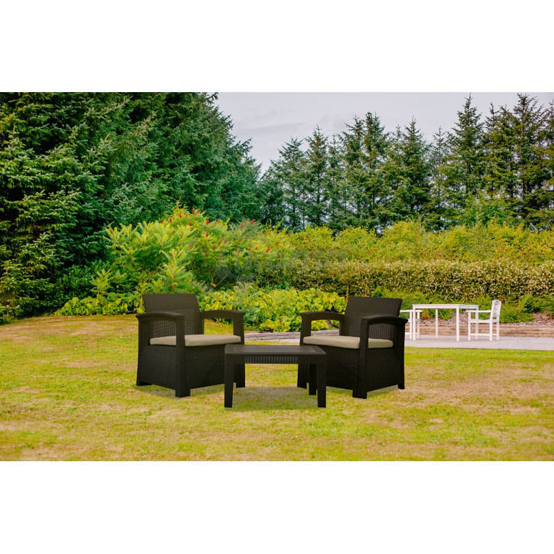 CHILLVERT conjunto balcón perugia resina(polipropileno inyectado) imitacion ratan formado por: 2 sofas individuales (69,4 x 62,5 x 75 cm) + mesa (70 x 50,5 x 38 cm). estructura color marron chocolate.cojineria en color beige con funda de poliéster