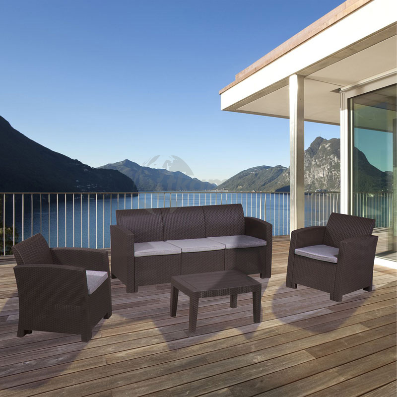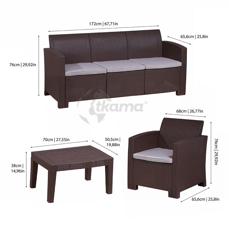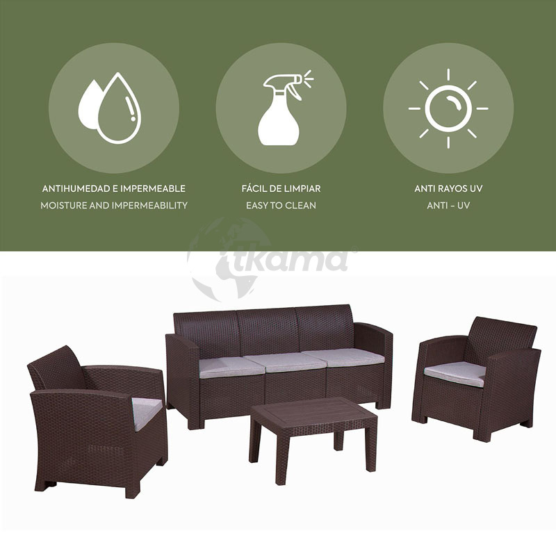 CHILLVERT conjunto jardín salerno marronresina(polipropileno inyectado) imitacion ratan formado por: 1 sofa 3 plazas(172 x 65,6 x 76 cm) + 2 sofas individuales (68 x 65,6 x 76 cm) + mesa (70 x 50,5 x 38 cm). estructura color marron chocolate. cojineria en poliespuma color beige con funda de poliéster