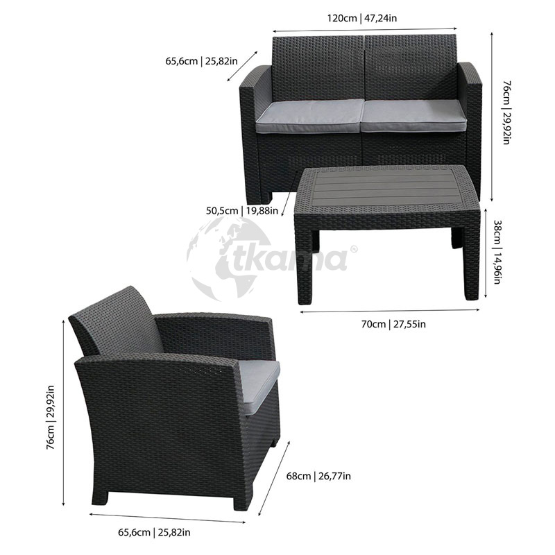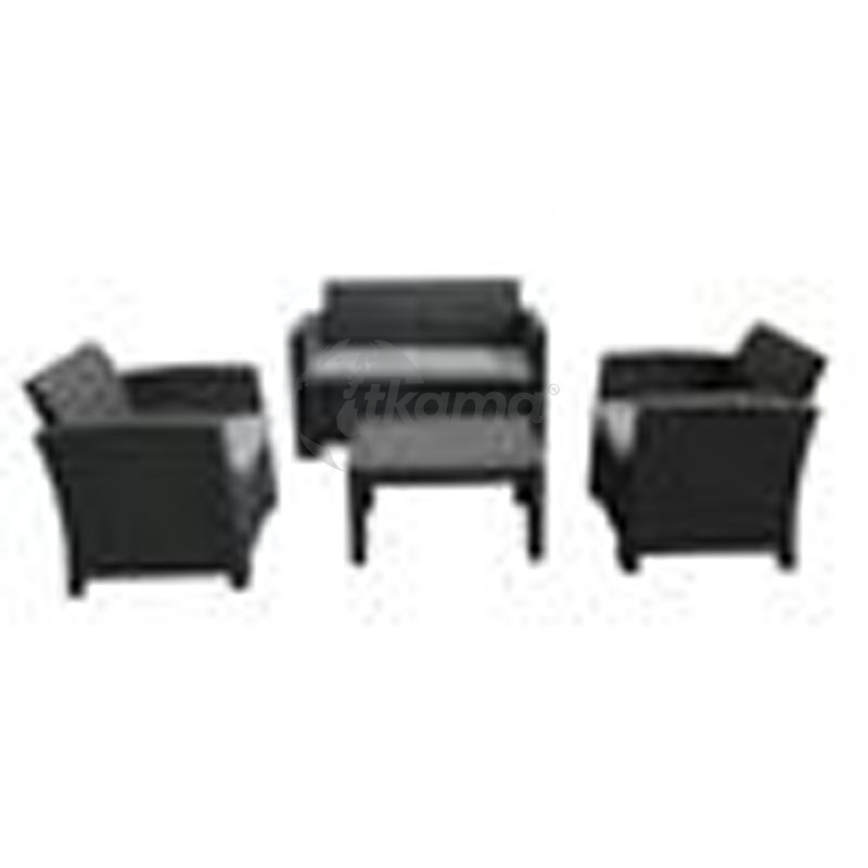 CHILLVERT conjunto jardín siena resina(polipropileno inyectado) imitacion ratan formado por: 1 sofa 2 plazas(120 x 65,6 x 76 cm) + 2 sofas individuales (68 x 65,6 x 76 cm) + mesa (70 x 50,5 x 38 cm). estructura color gris antracita.cojineria en poliespuma color gris claro con funda de poliéster