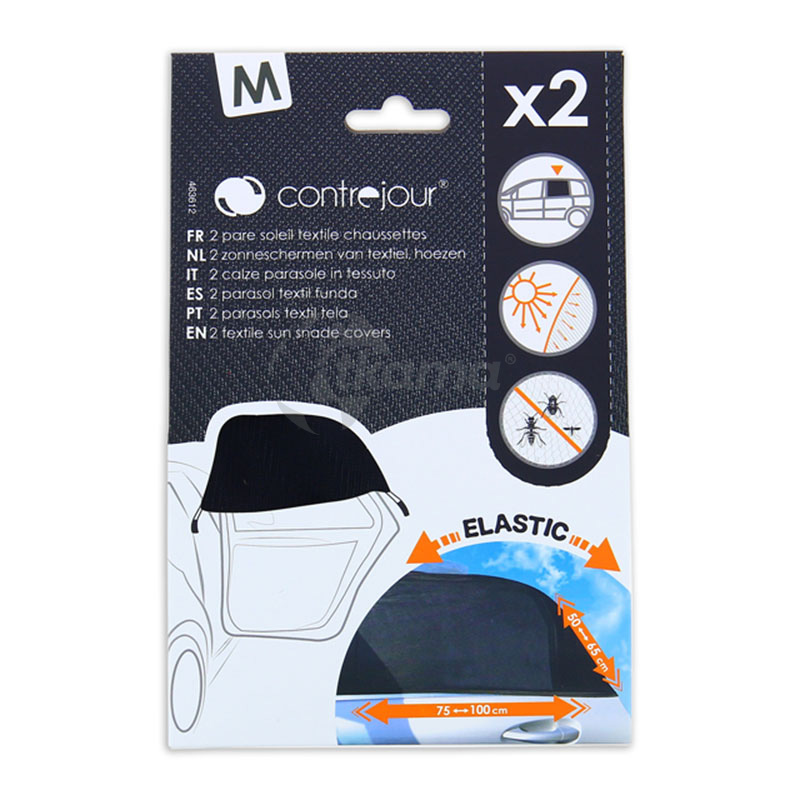 estas 2 cortinas textiles de doble cara con elásticos son fáciles de instalar y guardar. se ajustan como un calcetín al marco de cristal de las puertas traseras de tu coche.