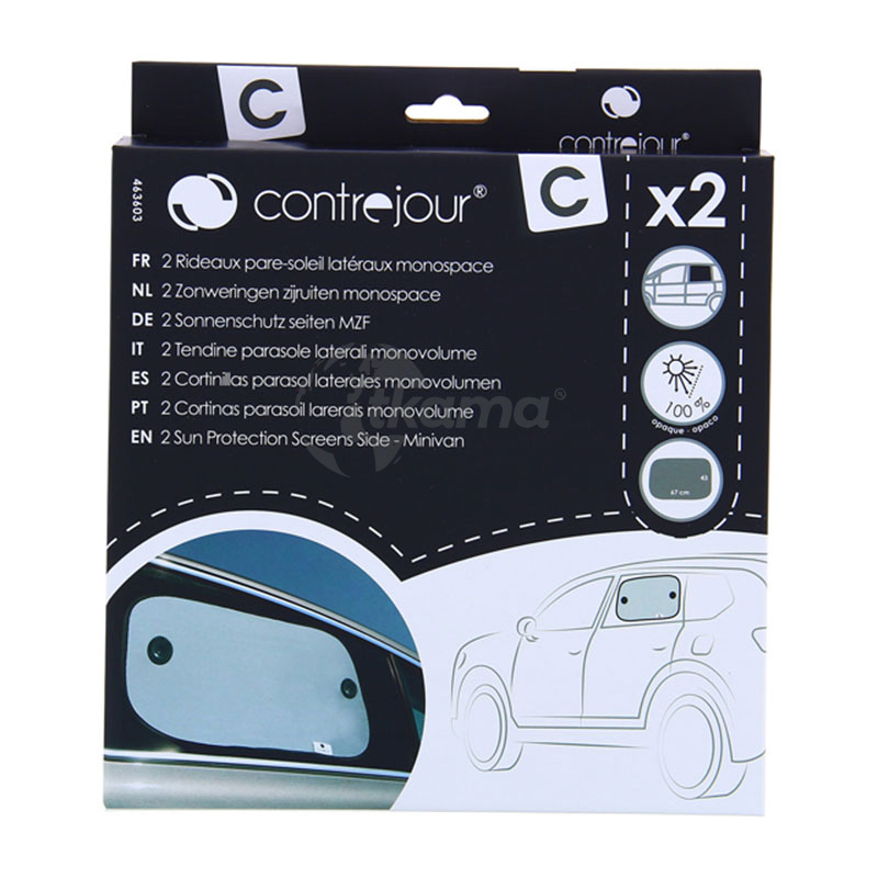 Contrejour es un nuevo concepto de cortinas para una protección solar total en el habitáculo de su vehículo. Con estos 2 lados, negro y aluminio, finalmente protegerá eficazmente su cabina y sus pasajeros del sol y el calor.