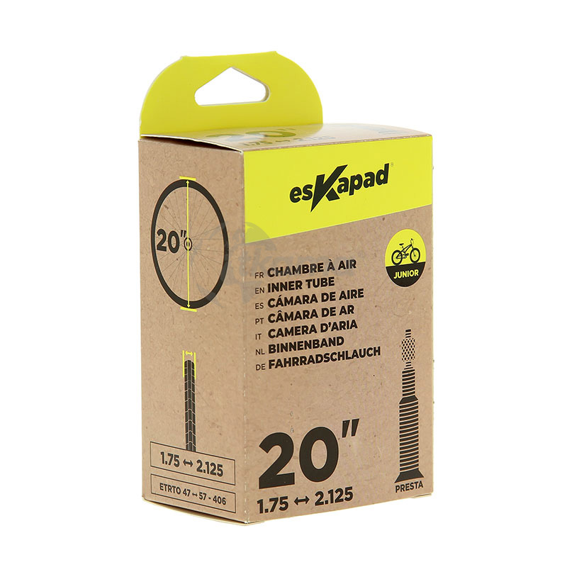 La cámara de aire esKapad está diseñada para bicicletas junior con ruedas de 20 pulgadas de diámetro. Adaptable a tramos de 1,75 a 2,125 con válvula presta. ETRTO 47 – 57 – 406