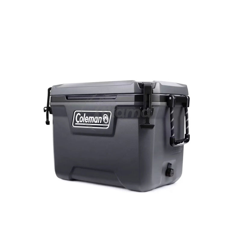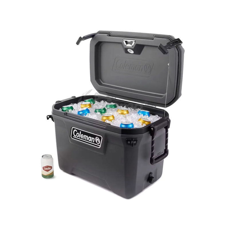 COLEMAN Capacidad: 52 L • Conserva (frío): 5 días con acumuladores Freez’Pack® (vendidos por separado) / 2 asas de cuerda laterales • Pintura refractiva con aditivo UV para una mejor protección de la nevera • Resistente a la corrosión / Aditivo anti-microbios. Cierre TempLock™ FX para un aislamiento superior. Con cierres de goma en la tapa para un sellado hermético. Bisagras, abrebotella y tornillos de acero inoxidable/ Válvula de desagüe. Dimensiones ext.: 66,3 x 38,6 x 44,5 cm. Peso: 5,7 kg
