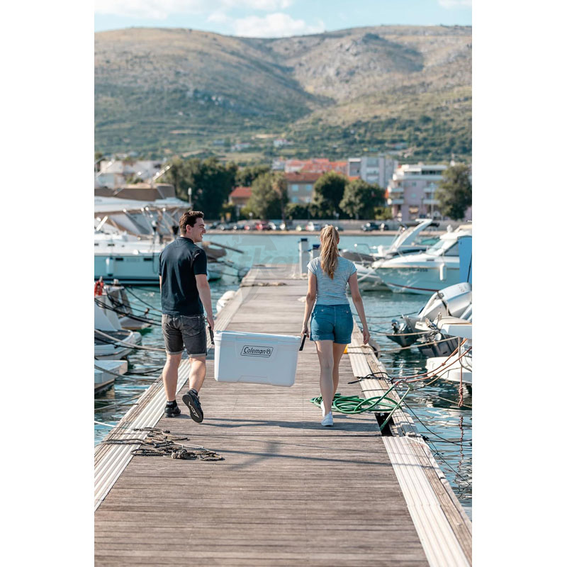 COLEMAN Capacidad: 66 L • Conserva (frío): 5 días con acumuladores Freez’Pack® (vendidos por separado) / 2 asas ergonómicas laterales • Pintura refractiva con aditivo UV para una mejor protección de la nevera • Resistente a la corrosión / Aditivo anti-microbios. Bisagras y tornillos de acero inoxidable / Válvula de desagüe. Dimensiones ext.: 79 x 39,5 x 43,5 cm. Peso: 6,29 kg